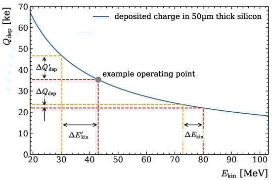Figure 2 shows the deposited charge in 50 μm-thick silicon for the relevant proton energies calculated using the stopping power table of the NIST pstar database []. The change in deposited charge is more sensitive to phantom WET changes for lower proton energies due to the steepening slope of the stopping power. To minimize multiple Coulomb scattering effects, the upstream detector is placed in the shallow part of the deposited charge curve at proton energies between 75 and 95 in the setup used. This energy regime is represented by the single red dashed line at 80 in Figure 2. A phantom WET change of results in the proton energy change . The corresponding small difference in measured deposited charge leads to a low WET resolution using the upstream detector. Hence, the PMMA absorber is used to further slow down the protons to energies between 25 and 60 before they impinge on the downstream detector. This range is represented by the red dashed line at 43 in Figure 2. Here, the same WET change of with the corresponding kinetic energy change results in the larger deposited charge difference . Thus, the WET resolution is higher using the downstream detector.