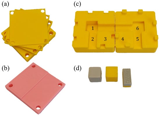 3D printed phantoms used in the presented studies. (a) PLA plates for WET calibration, (b) two-step phantom, (c) rectangular cuboid phantom with possibility to insert inlays made out of PLA and gPLA (shown in (d)).