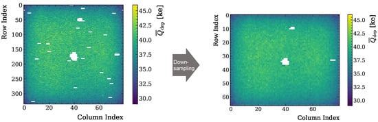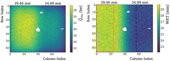 The uncertainty of the mean deposited charge per pixel is estimated using the standard error of the mean (SEM) with the sample standard deviation of the cluster charges measured by the pixel. To obtain a sufficiently low uncertainty for , superpixels are formed, consisting of five pixels in the row dimension and one pixel in the column dimension. Hence, the new pixel size is 250 μm × 250 μm. For the formation of superpixels, is calculated by averaging the cluster charges registered in the corresponding sub-pixels. An example of the originally measured mean deposited charge map for the homogeneous phantom with WET is shown in Figure 4 on the left side. On the right side, the corresponding downsampled mean deposited charge map using the superpixels is shown. Masked pixels are displayed in white.