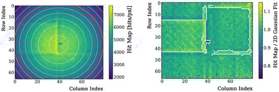 The ATLAS IBL pixel-detector module is a hybrid silicon pixel detector designed as a tracking detector for the ATLAS experiment at CERN []. The sensor matrix is separated into 336 × 80 pixels with a pixel size of 50 μm × 250 μm. Each pixel is connected individually to the corresponding analog readout circuit in the IBL readout chip. When an ionizing particle hits the sensor, it deposits energy according to its stopping power, generating a corresponding amount of charge.