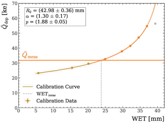 In order to take WET images with the TPIS, a measurement-driven calibration between deposited charge in the second detector and WET is carried out pixel-wise. This approach is based on the work of Metzner et al. [], but is modified to a pixel-wise calibration. For each of the WET values listed in Table 1 under the title Calibration Phantom, the mean deposited charge per superpixel is measured using the second detector (e.g., for WET in right image of Figure 4). For each WET value, three of the single acquisitions mentioned in Section 2.2.2 are taken. An inhomogeneous response across the detector is visible despite a homogeneously thick PLA phantom. For now, a pixel-wise -to-WET calibration counteracts this effect. Figure 6 shows the measured calibration data for a representative superpixel.