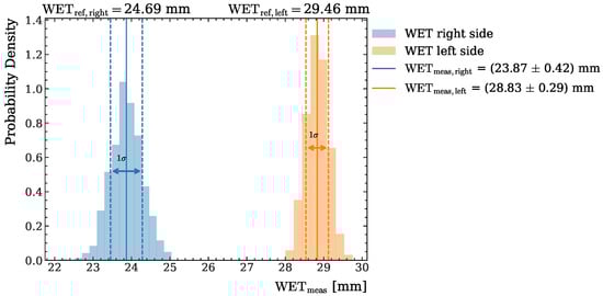 To evaluate whether the WET difference is measured with statistical significance, the precision of the measured WET contrast is studied. The lower plot in Figure 13 shows the uncertainty plotted against the WET values of the step phantoms. In addition, the maximum required uncertainty according to Equation (4) is plotted as horizontal dashed lines. Overall, decreases slightly with higher mean WET values per WET contrast and is lower than the required limit. Hence, except for the WET contrast 20.1/ , WET differences down to are determined with statistical significance using the TPIS prototype.