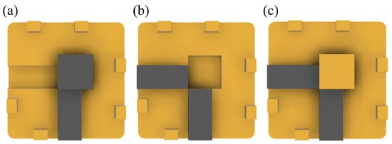 Cross-section of the three cuboid phantom setups in beam’s-eye view. (a) cube inlay and vertical arm are bone-like; the horizontal arm is filled with air. (b) Horizontal and vertical arms are bone-like, cube inlay is filled with air. (c) Horizontal and vertical arms are bone-like, PLA cube inlay used.