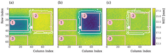 Per configuration, three single data acquisitions (see Section 2.2.2) were performed subsequently, and the WET images are calculated as described in Section 2.4. The phantom setup was changed from configuration (a) to (b) to (c), with a time difference of 8 min between each configuration.