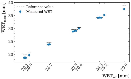 Measured WET value plotted against the reference WET value. Error bars represent the standard deviation of the WET values per WET ROI. For the x-axis labels, the WET values are rounded to one digit for better visualization.