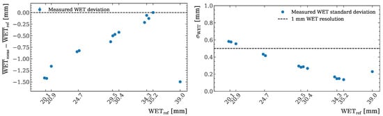 The right plot in Figure 12 shows the dispersion of measured WET values within an ROI that corresponds to the reference values . A dashed horizontal line is plotted, which represents the value that the standard deviation must fall below so that a WET difference of 1 mm can be distinguished (compare with Equation (3)).
