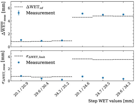 The determined mean values and standard deviations of each WET step are plotted as against the reference value in Figure 11. The theoretical values are depicted as black dashed horizontal lines. Please note that data points belonging to values that are close to each other are plotted against the same value for better visualization (compare with Table 1).