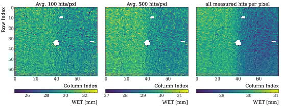As an example of the influence of the number of hits per pixel on the ability to resolve the WET contrast, the WET maps for 29.6/ WET contrast are shown in Figure 14 for 100, 500, and all measured hits per pixel (3000 hits/pxl) on average.