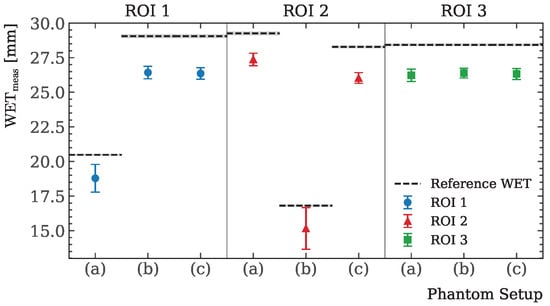 Measured WET per ROI plotted for each of the three different phantom setups shown in Figure 9. The error bars represent the standard deviation of the WET values per ROI. Each ROI is depicted in a certain color. The time difference between the measurements with setup (a) and (b) and setup (b) and (c) is approximately 8 min.