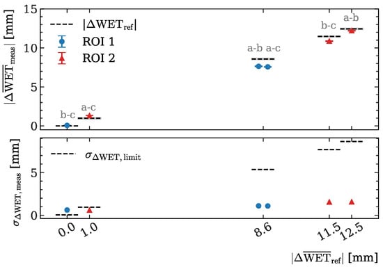 To quantify the precision of , the bottom plot of Figure 16 shows the corresponding uncertainty of the measured WET change. Here, the required upper limits based on Equation (4) are displayed as horizontal black lines. The observed uncertainty is below the corresponding limit for all cases where the phantom changes. Hence, the WET change is measured as statistically significant. For ROI 1 and the phantom change b-c, the criteria for are not applicable because no WET change is expected and measured.
