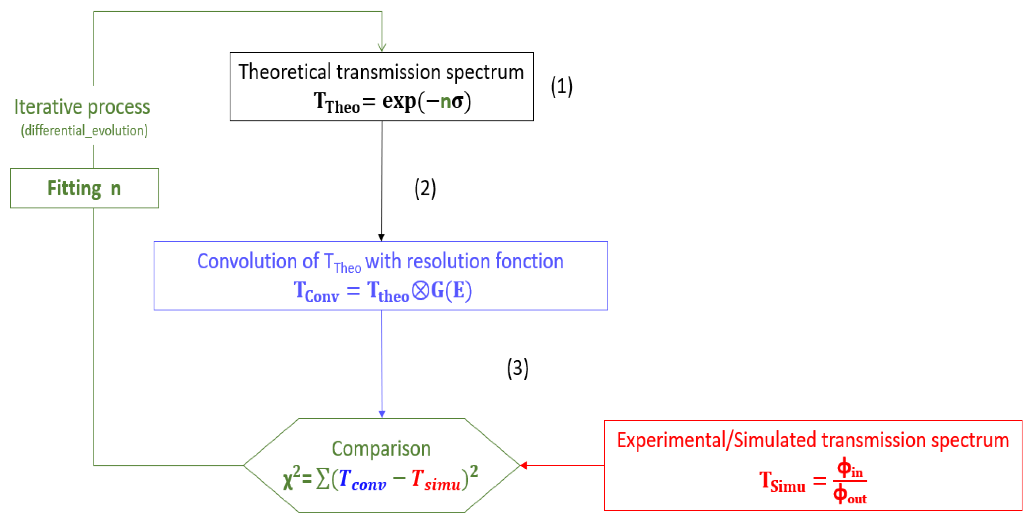 - Comparison of theory vs. data (from Monte Carlo simulation or experiment): the data spectrum is compared in each energy bin to the theoretical spectrum. A global minimum is determined using the differential evolution algorithm, which iteratively adjusts the material quantities (n) to achieve the best agreement between theory and simulation, as illustrated in Figure 3.