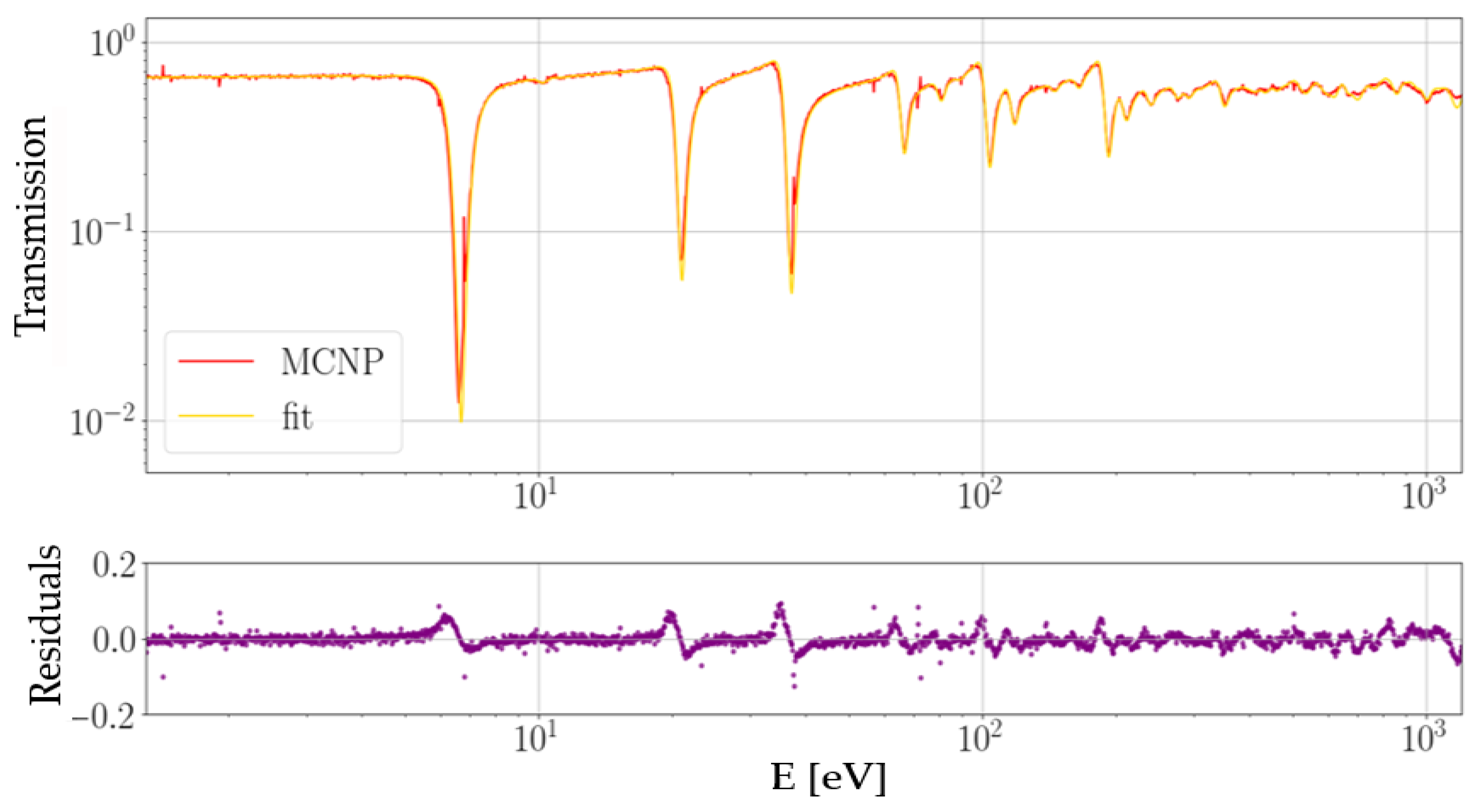 - Generation of theoretical transmission spectra: The theoretical transmission spectra were calculated using microscopic neutron total cross sections from the ENDF/B-VIII.0 library at 293.6 K, according to the Beer–Lambert law (Equation (1)), based on the assumed isotopic composition and areal densities of the sample. For the calculation, initial bounds are set for each material quantity (n), which are then iteratively refined using the differential evolution algorithm (implemented in SciPy library [21]) to fit the theoretical spectrum to the simulated (or experimental data).