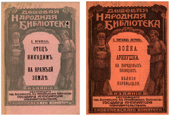 The price of these books does not always appear on the book itself, making it difficult to draw an accurate conclusion in this regard. The Deševaja narodnaja biblioteka booklets lack a precise indication of their price. From a comparison with other publications belonging to the same series (see the last pages of Mujžel’ 1916 and Oliger 1916), it is reasonable to assume that the Skovelevskij Komitet booklets were affordable even to the lower classes. Other publications from the same publisher, however, are marked by a higher price and are accompanied by a statement from the committee itself, explaining that the increased price is due to the allocation of the proceeds from the sale to the construction of war hospitals and to supporting the families of the fallen (see Vtoraja Otečestvennaja Vojna 1915–1916, p. ii). Overall, considering the range of prices of various publications as indicated in the advertisements on the back cover of some books of the years 1914–19159 and comparing these prices with the average annual income of the lower class in Russia at the end of 1913,10 we can assume that the conditions for speaking of dime literature do indeed exist in the Russian context of this period.