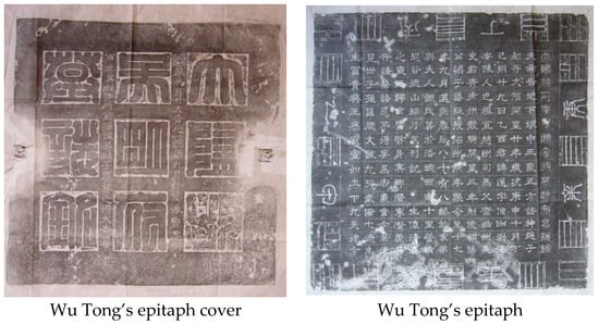 Wu Tong’s epitaph (Figure 1), the full name of which is “The Epitaph of the Late Magistrate Wu of Guangnian Country, Mingzhou Commandery, of the Great Sui” (大隋洺州廣年縣令故吳明府墓志銘), was unearthed in Luoyang (洛陽), Henan (河南) Province, in recent years (See Wang 2011). The epitaph is composed of an epitaph stone and epitaph cover. The epitaph cover is engraved with “The Epitaph of the Late Magistrate Wu of the Great Sui”. At the same time, the epitaph cover is also engraved with the symbols and characters of the Book of Changes (周易), and the content is intended to warn off tomb robbers. The epitaph records the Wu family lineage and official achievements of Wu Tong, who served as the Magistrate of Guangnian County in the Mingzhou Commandery during the early Sui Dynasty.