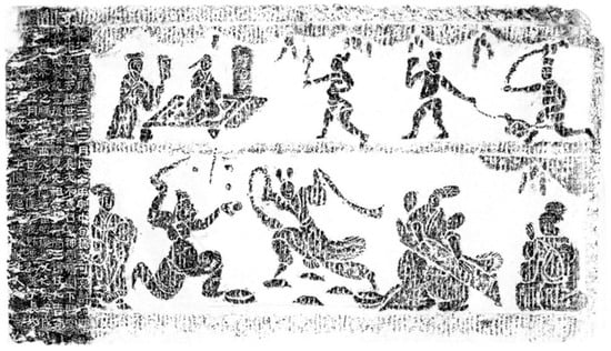 - Yulin diqu wenguanhui 榆林地區文管會, and Suide Xian Bowuguan 綏德縣博物館. 2002. Shaanxi Suide xian sishi lipu huaxiang shimu diaocha jianbao 陝西綏德縣四十裡鋪畫像石墓調查簡報. Kaogu yu wenwu 考古與文物 5: 19–26. [Google Scholar]