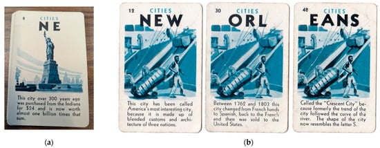 The Game of Cities () requires players to collect “books” of three cards, each spelling out one third of the name of a famous American city [Figure 3]. The first edition featured 17 cities, and the second war-time edition featured 12 cities. In both versions, each book is united by one repeated illustration, and by facts that tie each American city to indigenous origins, industrial outputs, or internationalist flavor. For instance, the “Orl” card in the New Orleans book reads, “Between 1762 and 1803 this city changed from French hands to Spanish, back to the French and then was sold to the United States”. The “Le” of Seattle reads, “The bulk of all the raw silk shipped from the Orient is unloaded and reshipped to all parts of the United States from this city. The “Wy” of New York boasts, “In this city there are more Germans than in Bremen, more Italians than in Rome and more Irish than in Dublin”. To capture any one book is to passively absorb three ways in which that city is a microcosm not only of one community, but of a globally integrated space. The greatest number of points comes from collecting the largest city by population (New York in both versions), and the smallest from collecting the card for the smallest city featured in the game, Houston in 1932 and Washington in 1945. The one city that leads players to lose points (100 points) in the 1932 version only, is the imaginary city of Taboo, the only city on the board in which “the Indians played no part in the early history”, there is “no commerce and industry”, and there is no “good harbor, fertile lands, natural resources and navigable rivers”. The Taboo city encourages young players to seek the real and avoid the imaginary. Understanding any real city in the twentieth century involves understanding its origins in the native and its dependence on imports from abroad.