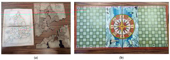 (a) A Map of England Dissected to Teach Youth Geography (). Left: The map provided with the puzzle pieces to guide the solve. Right: A partially solved puzzle. (b) Board of play for Game of the Mariner’s Compass ().