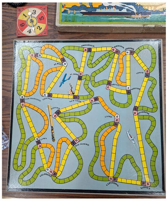 Game board and spinner for Around the World Game (). Players begin and end play in New York, and the object of the game is to “complete the tour of the world and return to New York” more quickly than the other players. The mode of travel is the main determinant of speed. Some cities can be accessed by Railroad (R), Plane (P), or Boat (B), and others by boat or plane only. The mode of transportation on which one lands (R, B, or P) determines the route one must take to get to the next city. The green tracks are the longest route, orange next, and yellow the most direct.