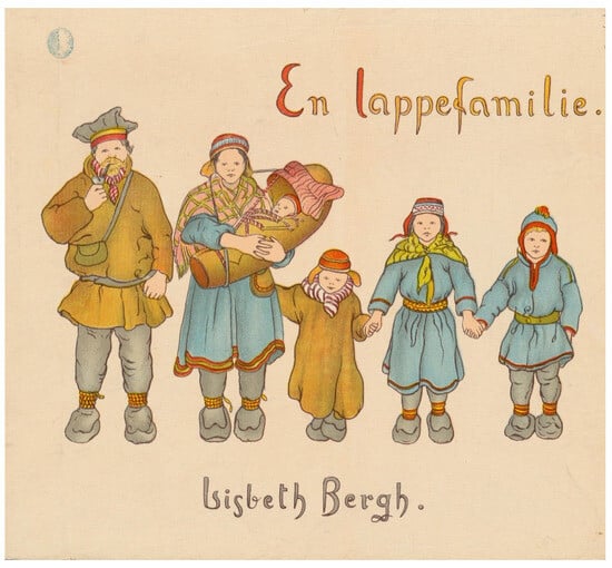 In 1905, the children’s book author, teacher, and illustrator Lisbeth Bergh (1861–1927) published one of the first Norwegian nonfiction picturebooks for children about Sámi, En lappefamilie: tekst og bilder fra Nordland (A Lappish family: text and pictures from Nordland, my transl.) (). The book is about a Sámi family and the family member’s life through four seasons in Nordland, with a particular focus on the summer season. The reader acquires information about the family’s daily activities, which include drafting and preparing meals as well as receiving visitors (tourists). The absence of nonfiction books for children about the Sámi at the beginning of the 20th century is probably related to the Sámi’s position in Norway at that time. Already in the 18th century, the Sámi were subjected to missionary efforts, and the Norwegianization policy of the mid-19th century led to a ban on speaking Sámi in schools and a devaluation of Sámi culture. This makes Bergh’s book an important contribution to the history of Norwegian children’s literature. Another reason for the book’s particular position is its verbal text representation, provided in three languages (Norwegian, English, and German). Beyond aiming to reach Norwegian children, it also seems to address foreign readers interested in Norwegian and Sámi culture. The dual reader address of the book may be due to the fact that Bergh’s book was published during a period of increasing interest in Sámi and other indigenous groups, as evidenced by the large world exhibitions and numerous “living exhibitions” in Europe and the USA, as well as the marketing of new tourist destinations involving the Sámi-dominated areas in Norway. The living exhibitions of the early 20th century reflected a need to organize and categorize the environment, and they were the result of «(…) this juncture between exoticism and knowledge, between fantasy and rationality» (). Simultaneously, a new sense of national identity developed in Norway after many years of Swedish control (). This reinforced the need to publish literature for children that clarifies both the familiar and the exotic parts of Norwegian culture, for instance, biographical accounts of Norwegian explorers and historical heroes ().