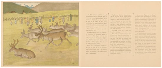 A Lappish family: text and pictures from Nordland have pictures on every spread, which indicates that it is a picturebook. As in Bergh’s previous publications, the illustrations are characterized by simplified motifs and bright colors. The pictures are naturalistic and primarily have an informative function. The iconotext reveals what the Sámi family wears and how they live, while at the same time excluding the harsher aspects of a Sámi life. According to (), this may be due to the neo-romantic style in picturebooks for children at the beginning of the 20th century. Even though the images are informative, the verbal text contributes to the clarification of the information conveyed by the images. Furthermore, rendering the text into three different languages (English, Norwegian, and German) implies that the anticipated reader might be unfamiliar with the Sámi heritage. Consequently, the visual and textual descriptions are clear and focused, avoiding unnecessary details.