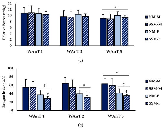 Anaerobic performance and physical fatigue measures for Wingate 1 (WAnT1), Wingate 2 (WAnT2), and Wingate 3 (WAnT3), for males (M) and females (F) during no music (NM) and self-selected music (SSM) conditions. (a) Relative power (watts/kilogram) and (b) fatigue index (watts/second). Data are presented as mean ± SD. * indicates significantly different from WAnT 1 (main effect) (p ≤ 0.05). ‡ indicates significantly different from male (main effect) (p ≤ 0.05). † indicates significantly different from NM (p ≤ 0.05).