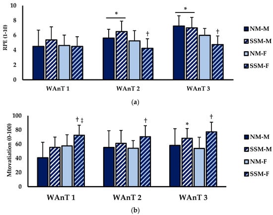 Test-to-test (WAnT1, WAnT2, and WAnT3) RPE and subjective motivation are shown in Figure 2. For RPE (1–10 scale) (Figure 2a), there was a main effect for test (p < 0.001; η2 = 0.148) and sex (p = 0.049; η2 = 0.098). However, no main effect existed for condition (p = 0.757; η2 = 0.001). There was a significant interaction for condition × sex (p = 0.013; η2 = 0.028) but not test × sex (p = 0.126; η2 = 0.022), condition × test (p = 0.068; η2 = 0.013), or condition × sex × test (p = 0.349; η2 = 0.005). Pairwise comparisons showed that RPE during NM-M for WAnT1 was significantly lower than NM-M WAnT2 (p = 0.027) and NM-M WAnT3 (p < 0.001). Furthermore, SSM-M for WAnT1 was significantly lower than SSM-M WAnT2 (p = 0.027) and WAnT3 (p = 0.002). During WAnT2 (p = 0.046) and WAnT3 (p = 0.040), RPE for SSM-F was significantly lower than NM-F. Motivation (1–100 scale) is displayed in Figure 2b. There was a main effect for test (p = 0.027; η2 = 0.26) and condition (p = 0.021; η2 = 0.105) but not sex (p = 0.197; η2 = 0.049). There were no interactions for condition × sex (p = 0.573; η2 = 0.005), condition × test (p = 0.283; η2 = 0.009), or condition × sex × test (p = 0.526; η2 = 0.005). There was an interaction for test × sex (p = 0.044; η2 = 0.022). Pairwise comparisons showed that for WAnT1, motivation for SSM-F was significantly higher than SSM-M (p = 0.031). Motivation during SSM-M was significantly higher during WAnT1 than WAnT3 (p = 0.030). Furthermore, motivation for SSM-F was significantly higher than NM-F for WAnT1 (p = 0.049), WAnT2 (p = 0.050), and WAnT3 (p = 0.032).