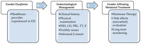 GD should be managed by a multidisciplinary team and diagnosis should be done by an expert physician with specific skills and abilities [5]. Based on fulfillment of diagnostic criteria by prior HCP’s evaluations, we aimed to describe the role of the endocrinologist in the management of the different gender-affirming treatment options and of clinical monitoring in transgender adults in our multidisciplinary single-center medical clinic dedicated to outpatients. In fact, also during the diagnostic workup, the endocrinologist is required to investigate on possible medical contraindications to the Gender Affirming Hormonal Treatment (GAHT). When a specific hormonal treatment for GD is practicable, it can be started without further investigations [6] after informing each patient about efficacy and possible side effects of GAHT and fertility preservation techniques [7]. The distress of living in an incongruent body and gender role is often present since childhood and adolescence, but the treatment of youths with gender incongruence is not a matter of discussion of the present review. Our general diagnostic-therapeutic approach is depicted in Figure 1.