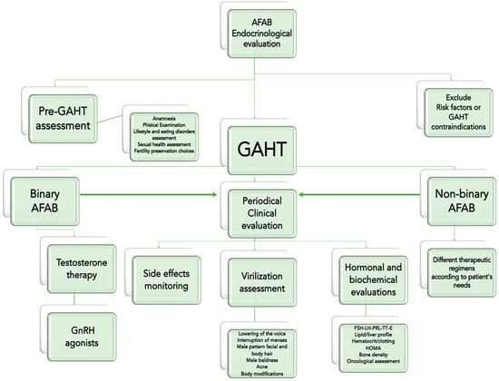 Actually, the classic view of gender binarism and GAHT should be reconsidered because of the increasing prevalence of non-binary individuals experiencing GD. Therefore, new therapeutic strategies should be also considered [17]. Since there is a lack in standardized hormonal treatment protocols for non-binary AFAB, GAHT goals should be adjusted according to patients’ needs in order to improve the self-perception and the quality of life [18]. For instance, different testosterone doses and/or other androgen preparations (i.e., nandrolone) are suggested to modulate the requested body changes [18], even if serious ethical concerns on some drugs exist.