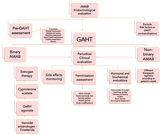 Before starting the hormonal treatment, clinicians should evaluate possible risk factors for thromboembolic events such as personal history of deep vein thrombosis or modifiable factors (e.g., obesity or smoking). The presence of pathological conditions that could be worsened by estrogen therapy (e.g., hyperprolactinemia, hypertriglyceridemia, cerebrovascular disease) [44] should be also assessed. Furthermore, fertility preservation techniques (e.g., sperm cryopreservation, surgical sperm extraction, and testicular tissue cryopreservation) should be discussed before starting GAHT [9].