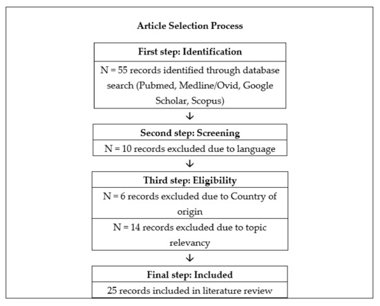Our search included both free text key words and acronyms of the following terms: “women”, “migration”, “Mediterranean”, “sexual violence”. Boolean operators and star truncation (*) were used as needed. We further conducted an in-depth review of the available grey literature on the same topic such as official documentation, policy and technical reports published by the European Union and other European, local and/or global organisations. Using a narrative synthesis approach, two authors independently extracted and analyzed data from published papers. After removal of duplicates, screening, and assessing for eligibility of 55 initially identified citations, 25 papers and policy papers were used for the purposes of this manuscript (see Figure 1).
