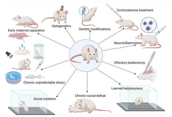 Animal models of anxiety and depression disorders. Most animal models are based on stress exposition at different temporal windows. However, other models have emerged by surgical, genetic, immune, and hormonal manipulations. For reference, see the main text. Created with BioRender.com (accessed on 20 December 2021).