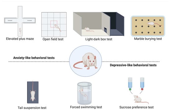 Behavioral tests used to study sex differences in anxiety-like and depressive-like behaviors in rodent animal models. Created with BioRender.com (accessed on: 20 December 2021).