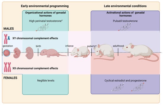 Unified model of sexual differentiation of brain and behavior. From gestation, sex chromosome complements orchestrate sexual differentiation of embryos by various Y and X genes. The expression of the Y exclusive gene Sry triggers the differentiation of bipotential gonads into testes, and their absence leads to ovaries development. Testosterone levels during the perinatal period in males (or their absence in females) interact with early environmental clues to modulate Y and X gene expression. Later in life, environmental conditions, activational gonadal hormones actions and direct genetic factors interact on early organized circuits to induce, deepen, or erase sex differences in brain and behavior. # Much of the testosterone actions are indeed mediated by estradiol and dihydrotestosterone metabolized in situ [70,71]. * Rapid rise of gonadal hormones at puberty has their own organizational effects [72]. Created with BioRender.com (accessed on: 20 December 2021).