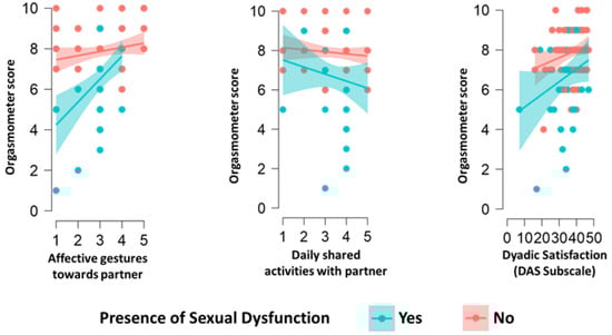 Three descriptive plots of ANCOVA are summarized in Figure 1. As shown, a higher increment of affective gestures towards partner is associated with higher Orgasmometer scores. In contrast, a higher increment of daily shared activities with partner is associated with lower Orgasmometer scores. Finally, higher scores in the “Dyadic Satisfaction” subscale of DAS are associated with better Orgasmometer scores.