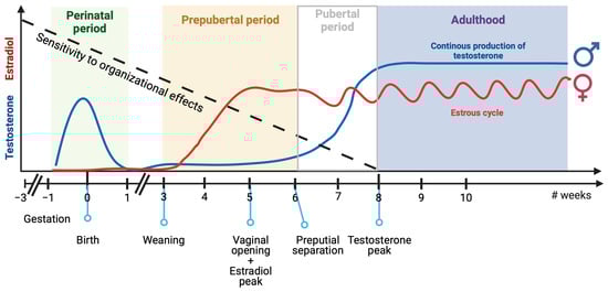 - Bell, M.R. Comparing Postnatal Development of Gonadal Hormones and Associated Social Behaviors in Rats, Mice, and Humans. Endocrinology 2018, 159, 2596–2613. [Google Scholar] [CrossRef] [PubMed]