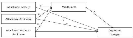 In step two of each model, we tested a mediated moderation hypothesis to examine the indirect effect of attachment avoidance (IV), attachment anxiety (moderator), and their interaction on mental health symptoms of depression and anxiety (DV) through mindfulness (mediator). Specifically, we hypothesized that the moderator would have a significant effect on the strength of the association between the IV and the mediator (path a), as well as the strength of the association between the IV and the DV (path c). Further, we conducted a conditional process analysis to probe the significance of the conditional direct and indirect effects at set values of the moderator (+/− 1 SD). The mediated moderation model is shown in Figure 1. Indirect effects were probed using the bootstrapping procedure (5000 samples).