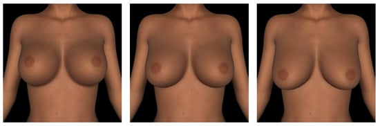 The breast stimuli were adopted from Pazhoohi et al. []. The original image set includes 36 images with breasts manipulated for breast size (A-, B-, C-, and D cup), intermammary distance (small, intermediate, and large), and ptosis (non, low, and high), which can be described as levels of sagginess. Lower levels of ptosis (e.g., non-ptosis) indicate a firmer breast appearance while higher levels (e.g., high ptosis) indicate a saggy appearance. To reduce the number of images presented, we elected to use the intermediate level of intermammary distance and keep the 4 levels of breast sizes and 3 levels of breast ptosis, for a total of 12 images presented. The images were originally created in the Daz3d program. The images only include a view of the woman’s lower neck to her upper torso (see Figure 1).