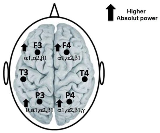 During the reading of the SETA, a higher AP in the alpha1, alpha2 and beta1 bands in the frontal (F3 and F4) and parietal (P3 and P4) locations was obtained. In addition, also during the reading of the SETA, a higher AP of the theta band in P3 and of the gamma band in P4 regarding the SET was observed (Figure 2). Only significant t-values and p-values, of each EEG band and the derivations, are mentioned in Table 1.