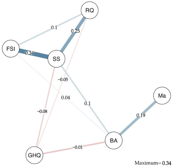 Network analysis. Notes: Nodes represent the key study variables; edges indicate significant connections between variables, with thicker lines representing stronger connections [36]; node size indicates variable centrality in the network, with larger nodes representing more central variables [36]; blue lines represent positive relations between variable, while red lines indicate negative relations; FSI = frequency of sexual intercourse; SS = sexual satisfaction; BA = body awareness; RQ = relationship quality; GHQ= General Health Questionnaire; Ma = masturbation frequency.