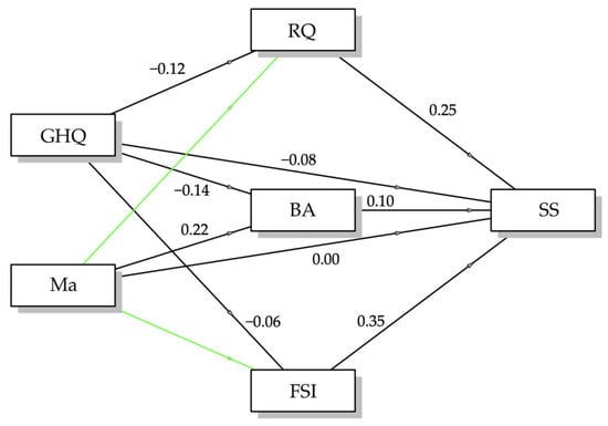 Mediation model of sexual satisfaction: effects of general mental health (GHQ) and masturbation frequency (Ma) with mediators. Notes: Figure 2 illustrates the mediation model with general mental health (GHQ) and masturbation frequency (Ma) as the independent variables, perceived body awareness (BA), frequency of sexual intercourse (FSI), and relationship quality (RQ) as mediators, and sexual satisfaction (SS) as the dependent variable. Path coefficients (β) are rounded to two decimal places. All reported component and direct effects were significant at p < 0.001, except for the direct effect of Ma on SS (p = 0.887). Green lines indicate relationships that were not calculated in the model.
