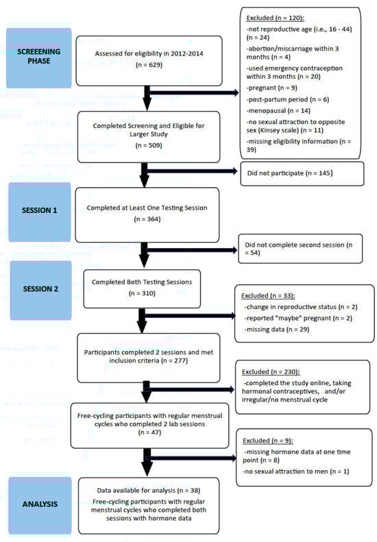 Participants were recruited within a larger project examining “hormones and sociosexuality” []. An initial sample of 629 completed a screening questionnaire, 364 participants met inclusion criteria for the larger study and completed at least one testing session, and 310 completed both sessions online or in the laboratory. Psychometric analyses on the mating intentions measures were completed using data from those who completed one testing session (N = 364). Participant flow is reflected in the EQUATOR STROBE flow chart in Figure 1. Those selected to participate in the two sessions across their menstrual cycle were of reproductive age (i.e., 16 to 44 years); had not had an abortion/miscarriage or used emergency contraception in the past three months; were neither pregnant, in the post-partum period, nor menopausal; had some attraction to men; and completed questions to assess these eligibility criteria. Overall, 47 participants living in northwestern Ontario, Canada participated in the laboratory portion of the present two-session cross-sectional observational study and met inclusion criterion [i.e., a regular menstrual cycle and free-cycling (not using hormonal contraceptives) and, thus, were eligible to provide saliva samples for hormone assay]. For inclusion in these analyses, participants were further screened with the following five post-hoc exclusion criteria: (1) missing hormone data at one of the two time points (n = 8); (2) no sexual attraction to men (n = 1); (3) pregnant (n = 0); (4) lactating (n = 1); and (5) menopausal (n = 0). As the visual stimuli included photos of men, and this study examined hormonal mating mechanisms from an evolutionary perspective (i.e., with reproduction as the goal), all participants had menstrual cycles and some attraction to men.