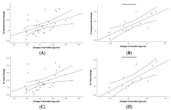 Change in estradiol and female short-term (ST) mating intentions. Scatterplots reflect correlations between changes in estradiol and changes in ST mating intentions across the menstrual cycle. The top row reflects these correlations for responsive mating intentions when evaluating men for a potential ST relationship in (A) the full female sample (r = 0.48, p = 0.006, n = 32), and (B) partnered participants (r = 0.81, p = 0.002, n = 12). The bottom row reflects bivariate correlations for all ST mating intentions when evaluating men for a potential ST relationship for (C) the full female sample (r = 0.44, p = 0.013, n = 32), and (D) partnered participants (r = 0.79, p = 0.002, n = 12). Each graph includes the line of best fit with the 95% CIs.
