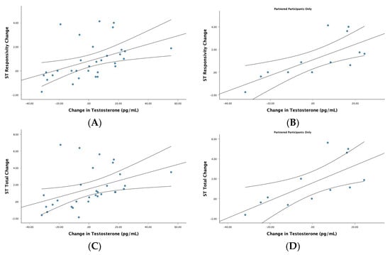 Change in testosterone and female short-term (ST) mating intentions. Scatterplots reflect correlations between changes in testosterone and changes in ST mating intentions across the menstrual cycle. The top row reflects these correlations for responsive mating intentions when evaluating men for a potential ST relationship in (A) the full female sample (r = 0.44, p = 0.013, n = 31), and (B) partnered participants (r = 0.73, p = 0.007, n = 12). The bottom row reflects these bivariate correlations for all ST mating intentions when evaluating men for a potential ST relationship for (C) the full female sample (r = 0.41, p = 0.021, n = 31), and (D) partnered participants (r = 0.69, p = 0.013, n = 12). Each graph includes the line of best fit with the 95% CIs.