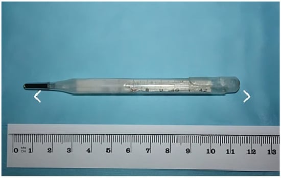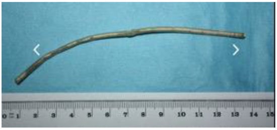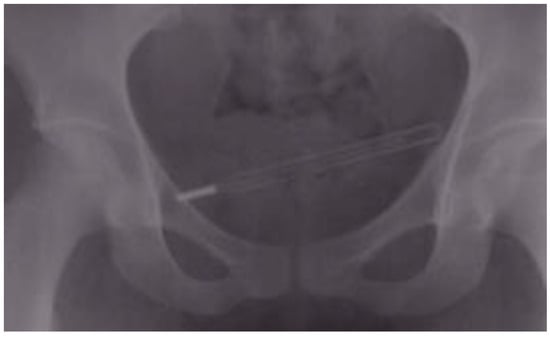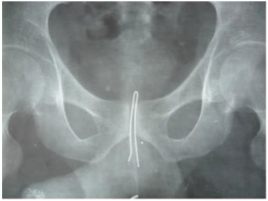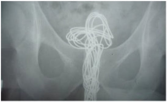 - Rahman, M.; Bari, A.K.M.A.; Khatoon, S.N. An Unusual Self-Inflicted Foreign Body in the Urinary Bladder and Uret hra: A Case Report. Bangladesh J. Urol. 2020, 18, 94–97. [Google Scholar] [CrossRef]