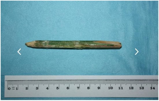 - Ahmed, M.M.; Ahmed, N.A.; Sharma, V. A Self Inserted Unusual Foreign Body “An Entire Pencil” in a Male Uret hra and Bladder: A Case Report. Cureus 2022, 14, e25198. [Google Scholar] [CrossRef]