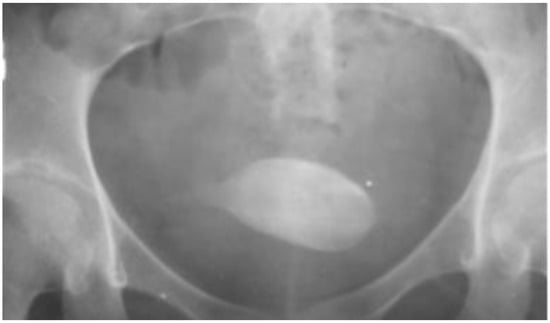 The most common imaging test used to confirm the diagnosis was a plain KUB X-ray, which was usually sufficient [2,4,6]. In some recent cases, CT scan and ultrasonography also play an important role in confirming the diagnosis [12,23].