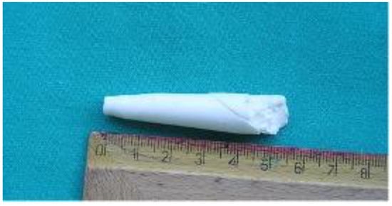 On 8 April 2007, a 25-year-old female patient was admitted to the Department of Urology due to recurring urinary tract infections accompanied by urination difficulties. During the gathering of her medical history, she revealed that about five weeks earlier, while she had been masturbating with a pencil, the pencil had accidentally displaced into her urinary bladder. A cystoscopy was performed, and the foreign body was removed via a transurethral approach [Figure 3]. The postoperative period was uncomplicated, and the follow-up was without complications.