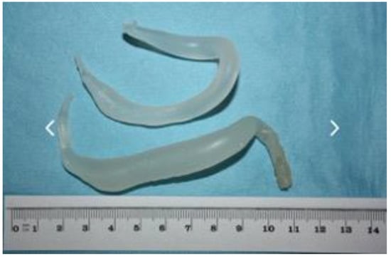 On 11 September 2018, a 26-year-old male patient was admitted to the Urology Department presenting with micturition difficulties and pronounced dysuria. The patient was intoxicated with alcohol and reported that he had humorously injected silicone into his urethra. He had attempted self-removal of the substance for one week prior to admission. Upon evaluation, he exhibited severe abdominal pain, pyuria, and dysuria, necessitating his visit to the emergency department. A transurethral procedure was performed to remove the silicone in fragments [Figure 14]. The postoperative course was uneventful. The patient failed to attend the scheduled follow-up appointment.