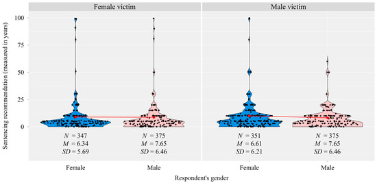 ANOVAs were conducted with the genders of both the victims and respondents as independent variables and various dependent variables. The results (Table 3) indicated that the effects of the victim’s and respondent’s gender on sentencing recommendation were not significant, presumably due to its large standard deviations. Nevertheless, the effect of victim’s gender was significant when outliers were excluded. Specifically, as illustrated in Figure 2, offenders were recommended longer sentences when the victim was male, even when responses recommending sentences that exceeded 30 years (F(1, 747) = 7.75, = 0.01, p < 0.01) and more than 2 SDs longer than the overall mean were excluded (F(1, 747) = 4.43, < 0.01, p = 0.04). Nevertheless, the effect sizes were relatively small and explained only approximately 1% of the variance in sentencing recommendation.