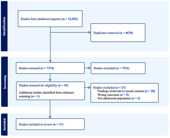 The six database searches returned 12,052 results, which were imported into Covidence. Of those, 4678 duplicates were identified and removed, resulting in a total of 7374 for title and abstract screening. A total of 7331 articles did not meet the eligibility criteria and were excluded, leaving 43 articles to be subjected to full-text review. A hand search of the reference lists from these 43 publications resulted in 1 additional article included in the full-text review. Initially, the authors independently reviewed the articles and followed the eligibility criteria strictly. However, one of the criteria—sexual consent conceptualization, communication, or behavior as the main focus of the study’s aims or findings—severely limited the final sample to only four articles [32,55,58,69]. After a discussion, it was determined that the authors would return to the full-text review stage and lower the threshold for criteria to include articles that incorporate some data relevant to sexual consent and the research question, despite it not being the main focus of these studies. Following this process, 17 articles were included for abstraction and analysis. It should be noted that two of these articles came from the same cross-sectional study [70,71]; however, since the analyses differed and produced varying results related to sexual consent, they were both included. See Figure 1 for the PRISMA-ScR flow diagram depicting the screening process.